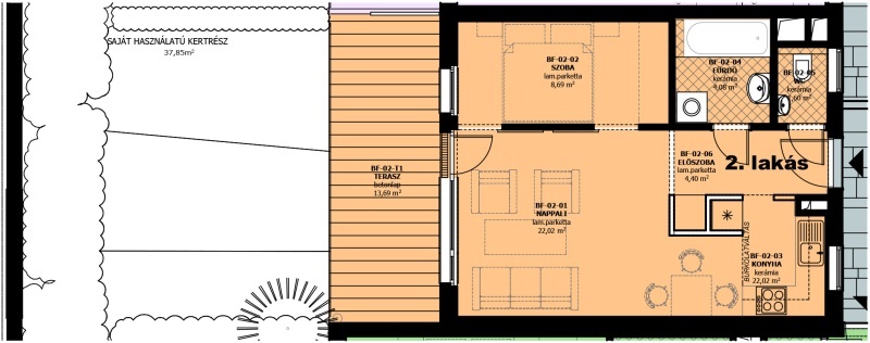 B épület, földszint 2. lakás – 41 m² | 1+½ szoba | 14 m² ÉNy-i tájolású terasz és kert