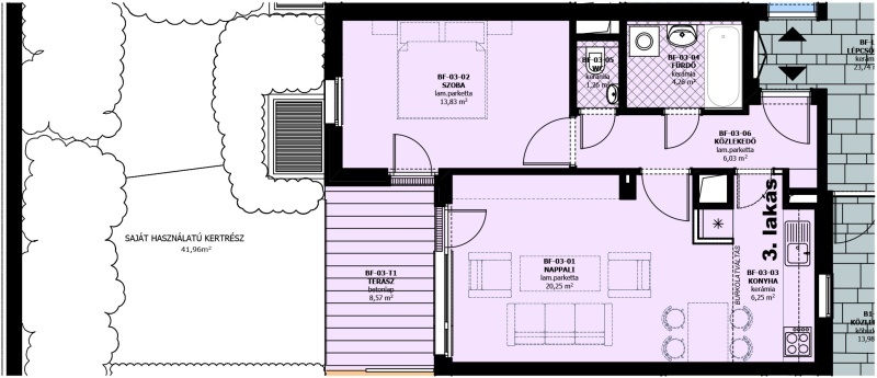B épület, földszint 3. lakás – 52 m² | 2 szoba | 7 m² ÉNy-i tájolású terasz és saját kert