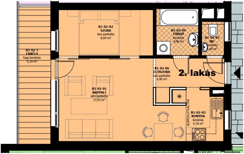 B épület, 1. emelet 2. lakás – 41 m² | 1+½ szoba | 9 m² ÉNy-i tájolású erkély