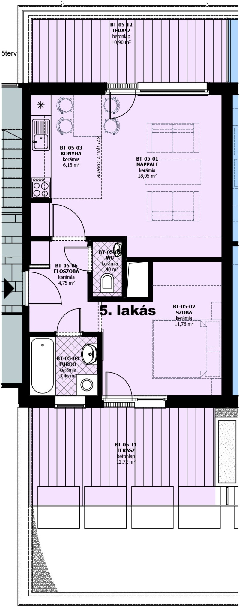 B épület, földszint 5. lakás – 40 m² | 1+½ szoba | 9 m² ÉK-i tájolású terasz | saját, nagy kert