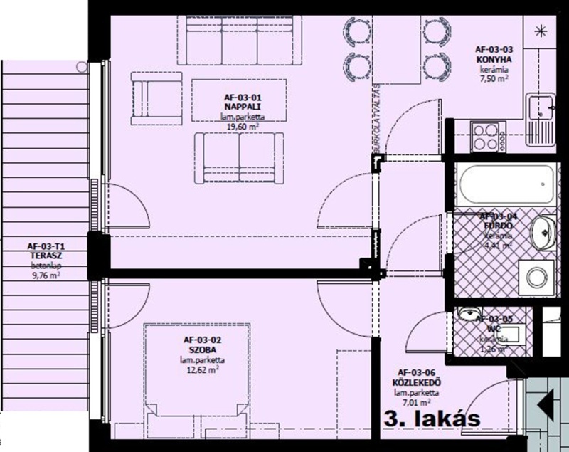 A épület, 2. emelet 1. lakás – 60 m² | 1+2 fél szoba | 32 m² DK-i + 17 m² ÉNy-i terasz