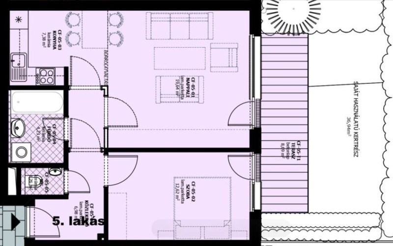 B épület, földszint 5. lakás – 40 m² | 1+½ szoba | 9 m² ÉK-i tájolású terasz | saját, nagy kert