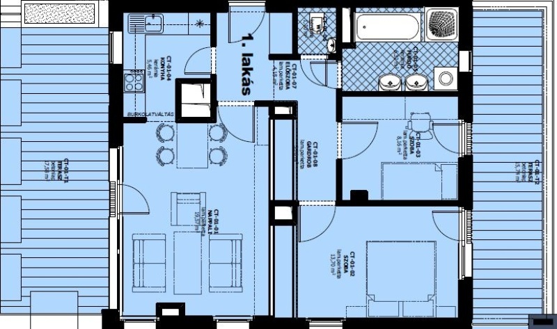 A épület, 2. emelet 1. lakás – 60 m² | 1+2 fél szoba | 32 m² DK-i + 17 m² ÉNy-i terasz