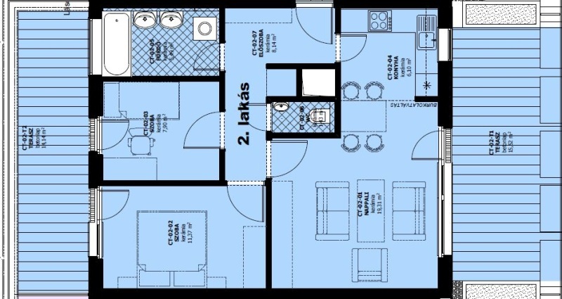 C épület, 2. emelet 2. lakás – 60 m² | 2+½ szoba | 2 terasz, összesen 30 m²