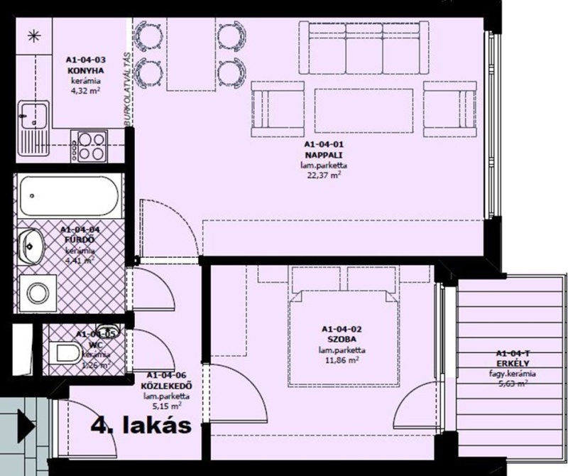 A épület, 1. emelet 4. lakás – 50 m² | 2 szoba | 6 m² DK-i tájolású erkély